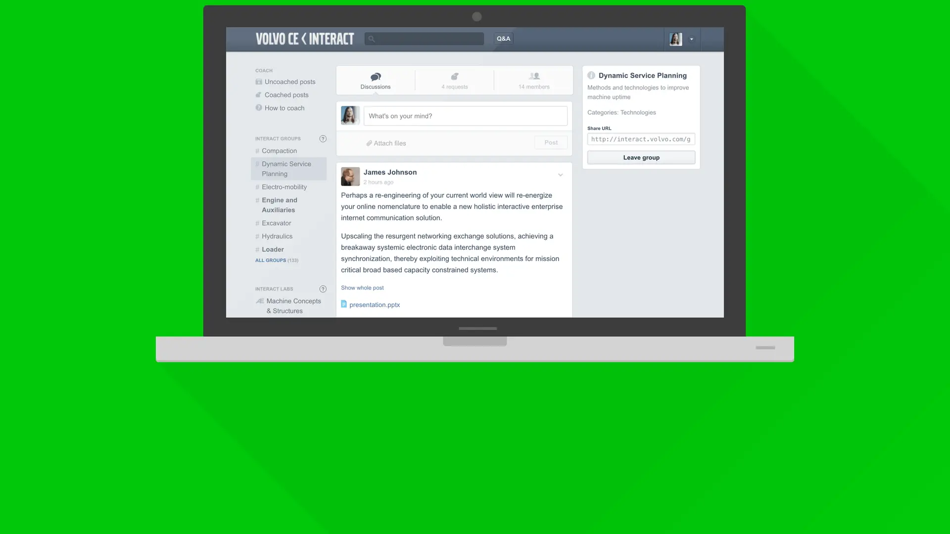 Volvo CE Interact är en interaktiv plattform för idéer och vägledning. Tjänstens roll är att synliggöra idéer, skapa diskussioner och tillhandahålla vägledning fram till dess att en idé kan utvecklas till ett finansierat projekt.